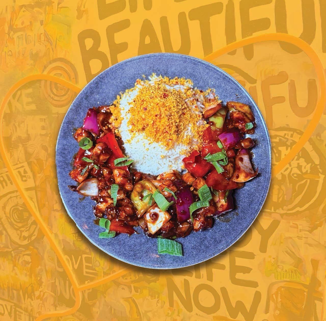Orez Basmati, Ceapă, Ardei gras, Frunze de ceapă, Sos de roșii, Sos de stridii, Ulei de pește, Ulei de susan, Usturoi,